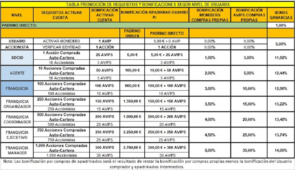 4.- El Usuario debe entender que somos un Club Social de Aportación Colectiva y Reparto Colectivo, por lo que todo Usuario tiene que Apadrinar como mínimo un nuevo Socio, comprar al menos una AVIPS, Activar su Cuenta de Franquicia en su primer año, o que no se registre en la Web con su nombre de Usuario y contraseña en un periodo superior a tres meses, podrá ser dado de baja como usuario, perdiendo las Bonificaciones de Cartera y Monedero.